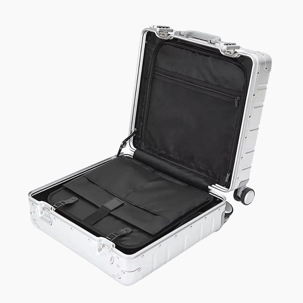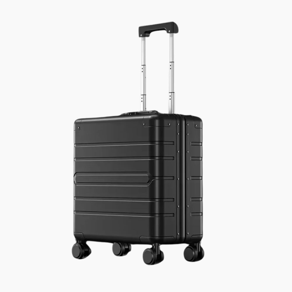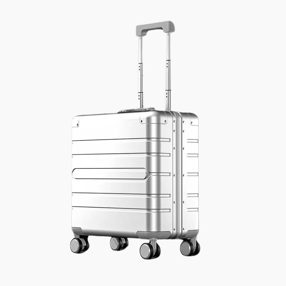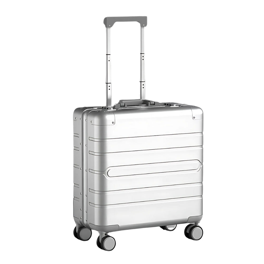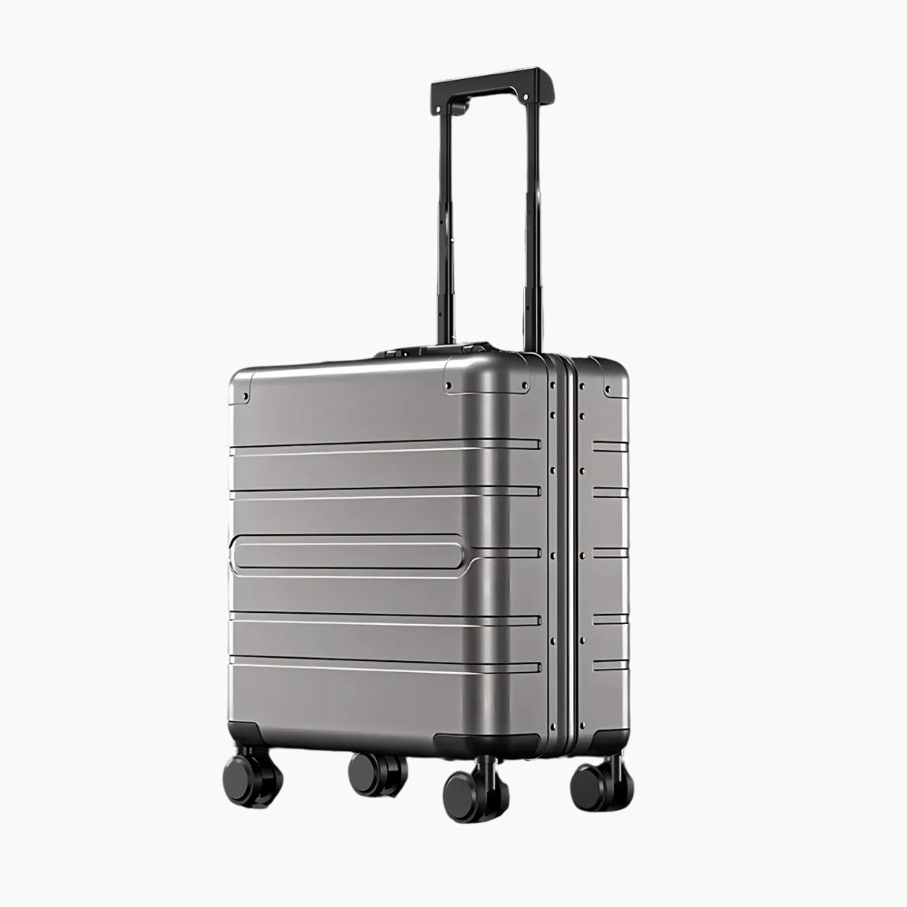 KOMPAKT 18-tums kabinväska är ett förstklassigt val för dig som reser med stil. Tillverkad i slitstark aluminium-magnesiumlegering kombinerar den ett elegant utseende med robust prestanda. Med sin kompakta storlek på 42.5 × 22.5 × 46.5 cm (enligt flygbolagsstandard för handbagage), är den perfekt för korta affärsresor eller helgresor.